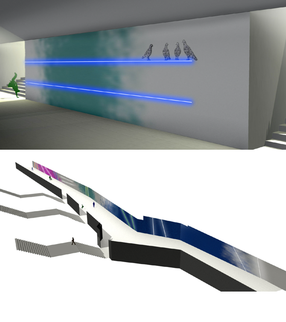 The title of the artwork describes both the underpass tunnel itself as a place and the attempt to transform it into a platform for imagination and dreaming about travel. The artwork brings human scale, surprising elements, and a feeling of safety to the tunnel.