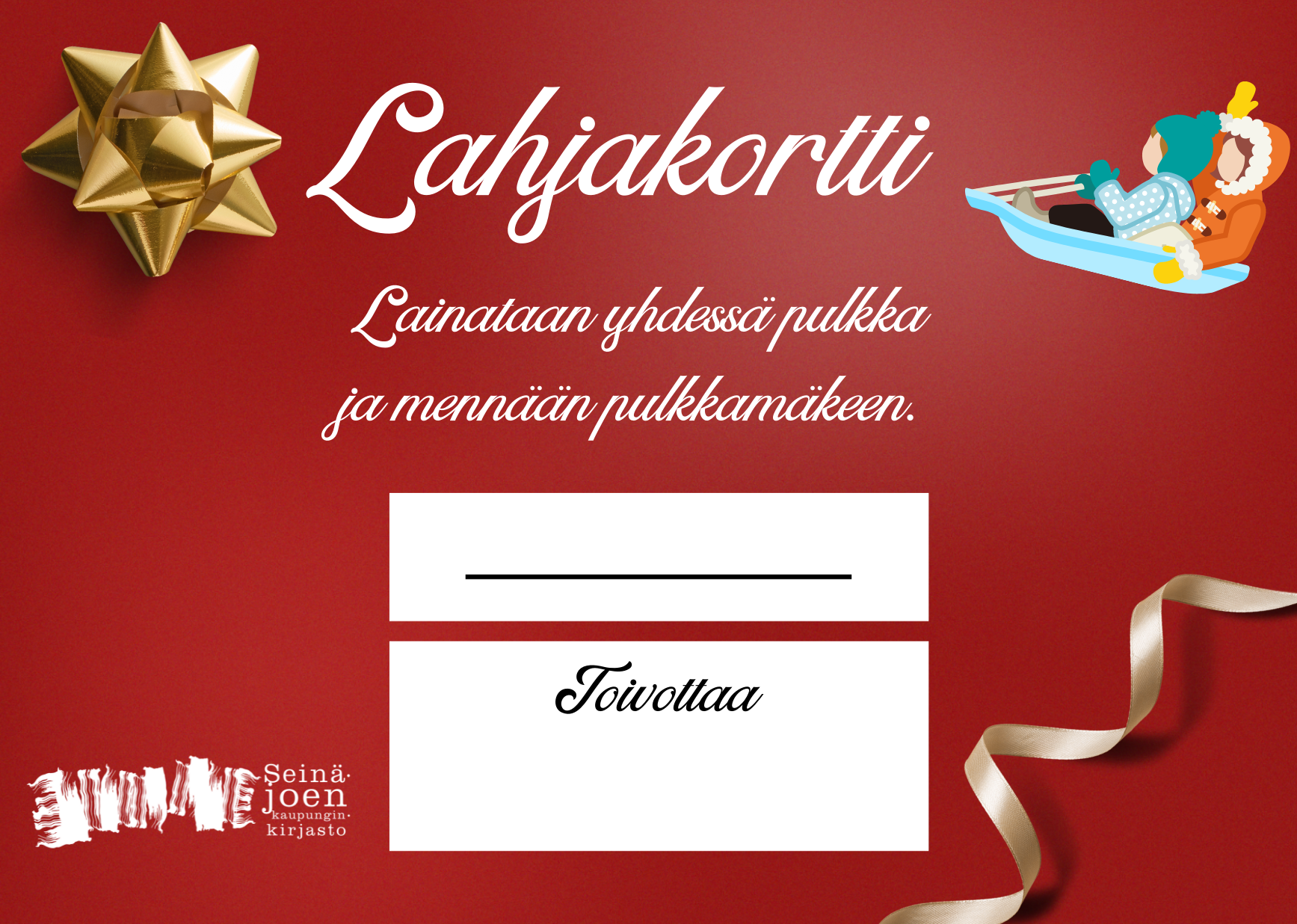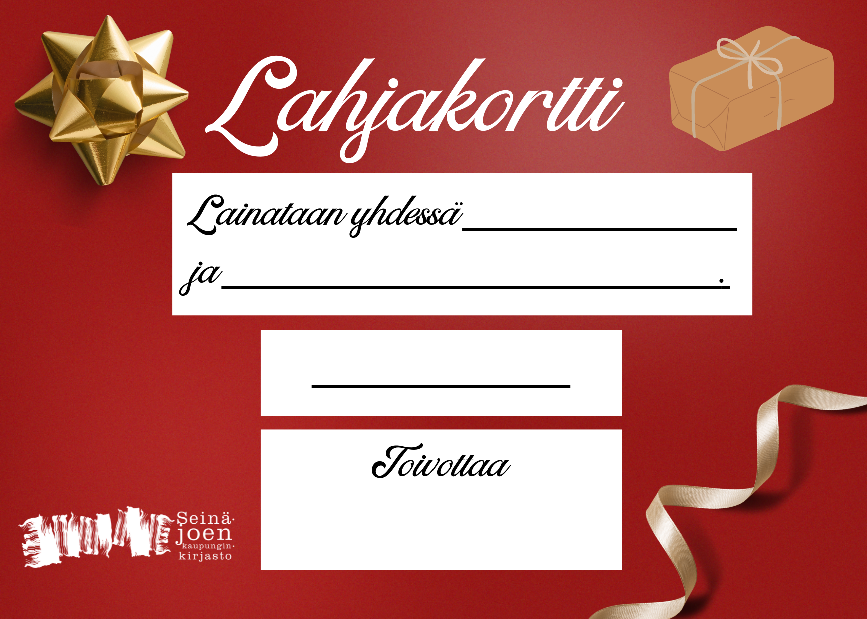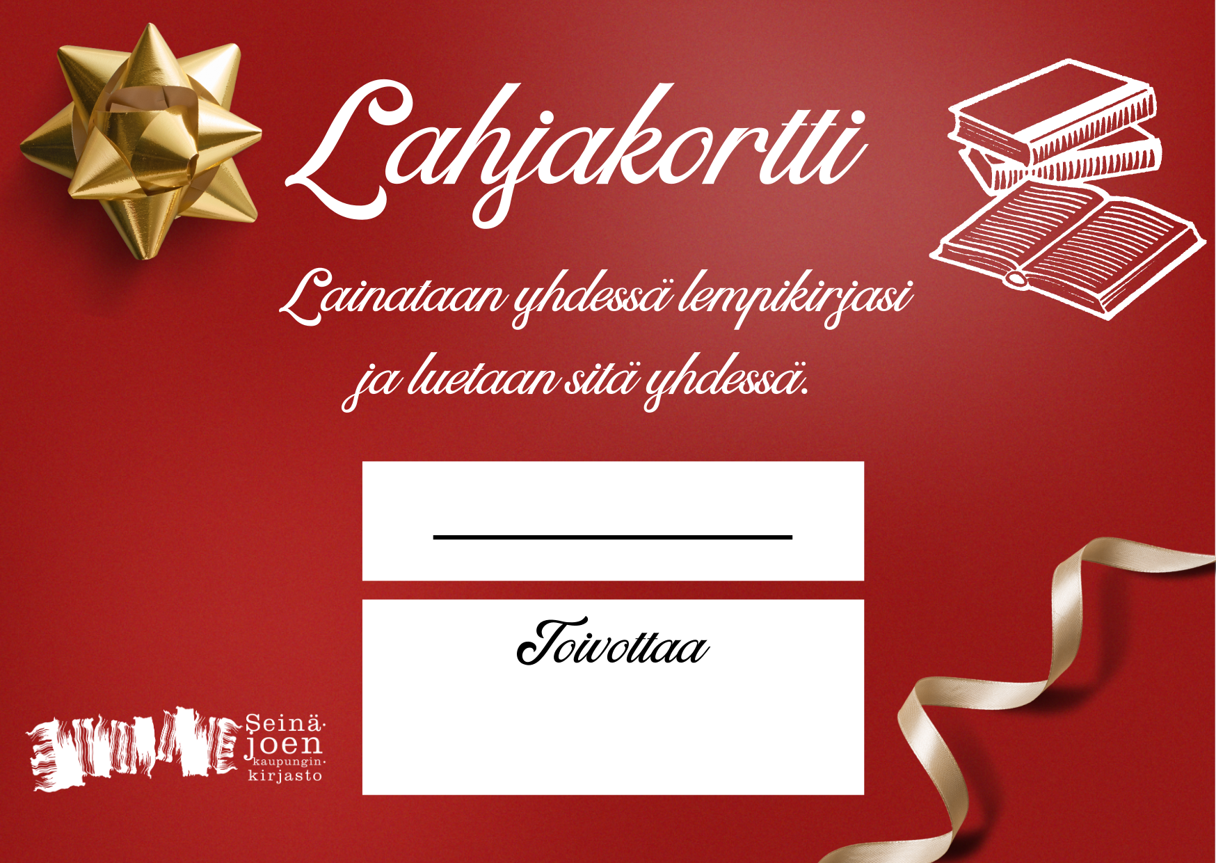 Tämän tiedotteen liitteenä on valmiita lahjakorttipohjia, joista voit ottaa käyttöön itsellesi sopivan. Valmiiksi tulostettuja lahjakortteja voit myös hakea kirjastoista ja kirjastoautoista. Mukana on yksi tyhjä korttipohja omille lahjaideoille.
