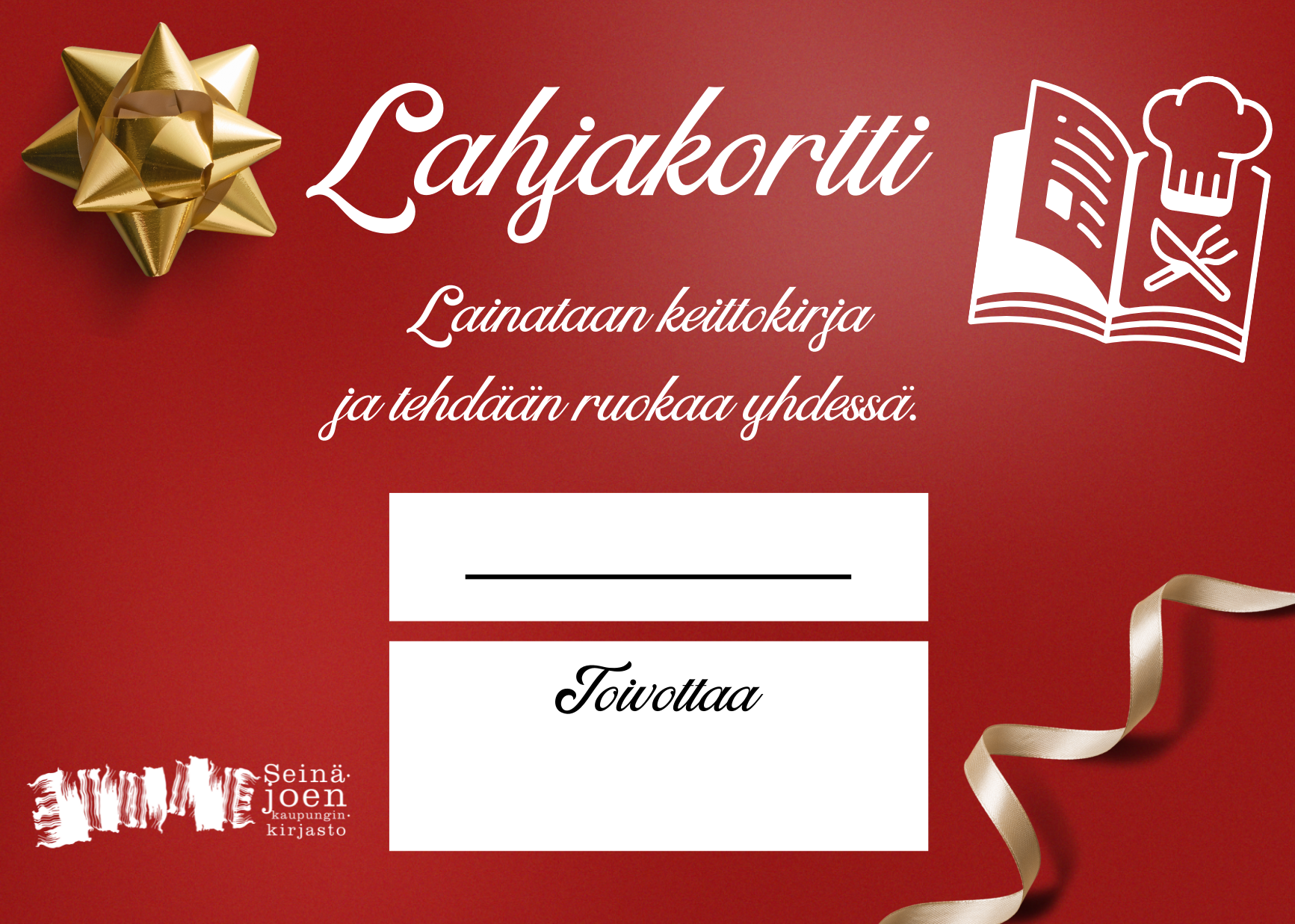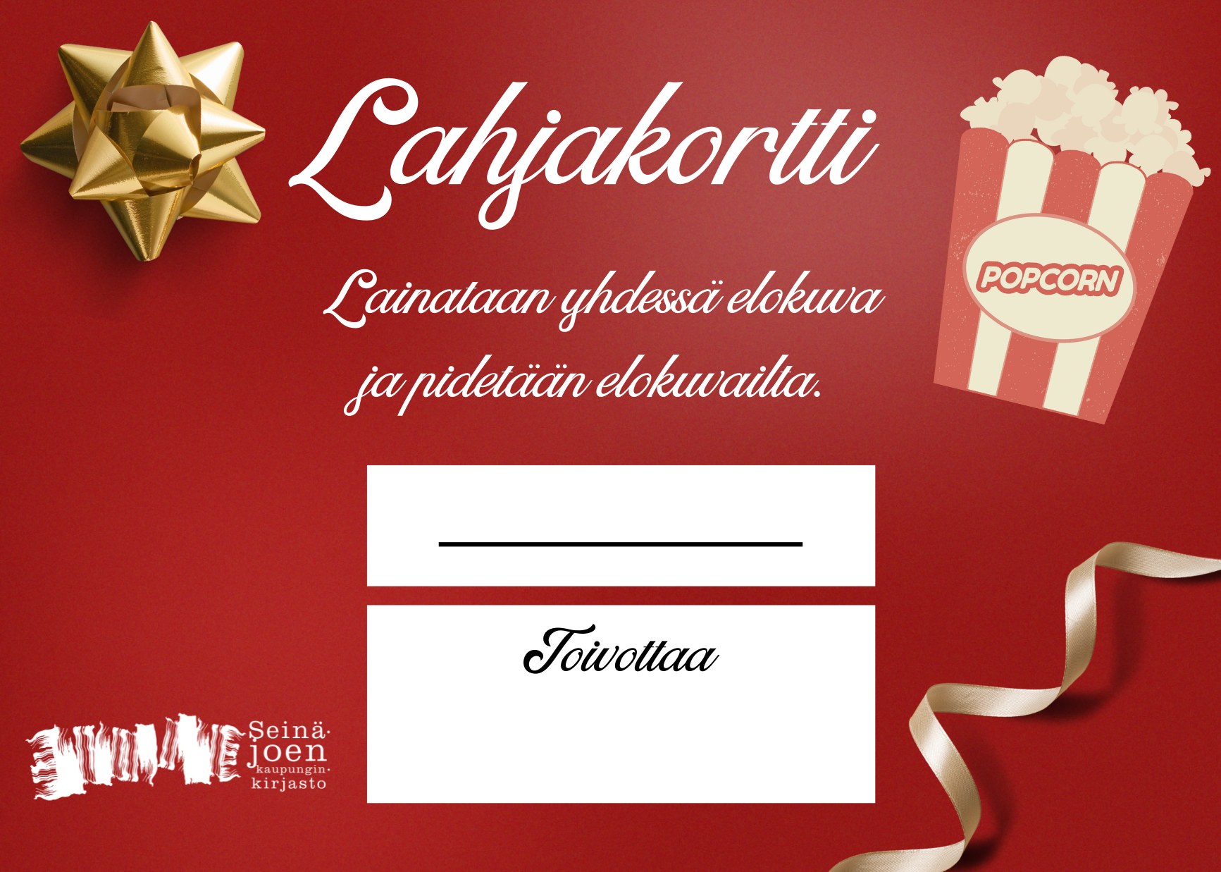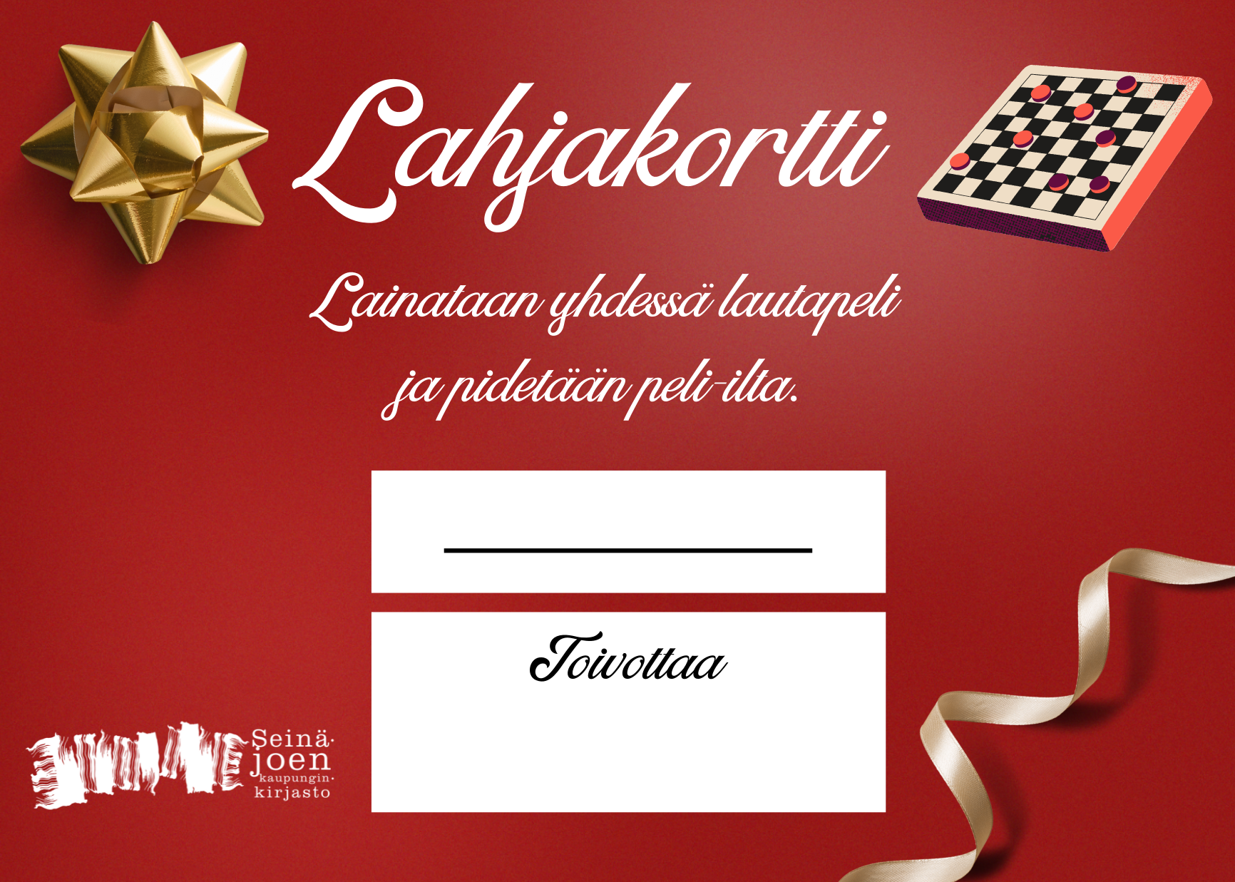 Tämän tiedotteen liitteenä on valmiita lahjakorttipohjia, joista voit ottaa käyttöön itsellesi sopivan. Valmiiksi tulostettuja lahjakortteja voit myös hakea kirjastoista ja kirjastoautoista. Mukana on yksi tyhjä korttipohja omille lahjaideoille.