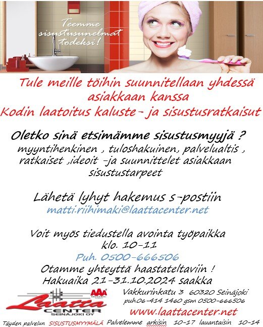 Jokainen päivä on erilainen,Saat toteuttaa myyjänä itseäsi ja ammattitaitoa.Joustavat työajat.Palkitseva myynti työ.