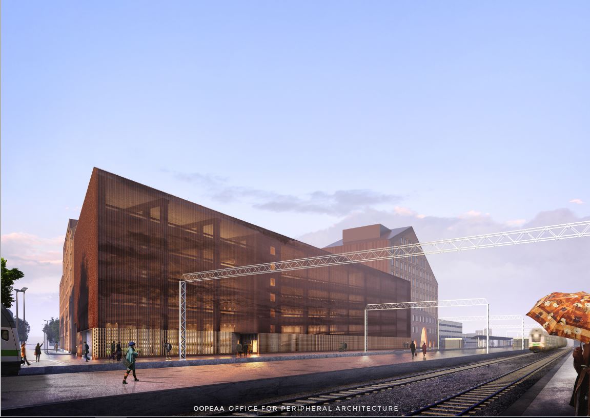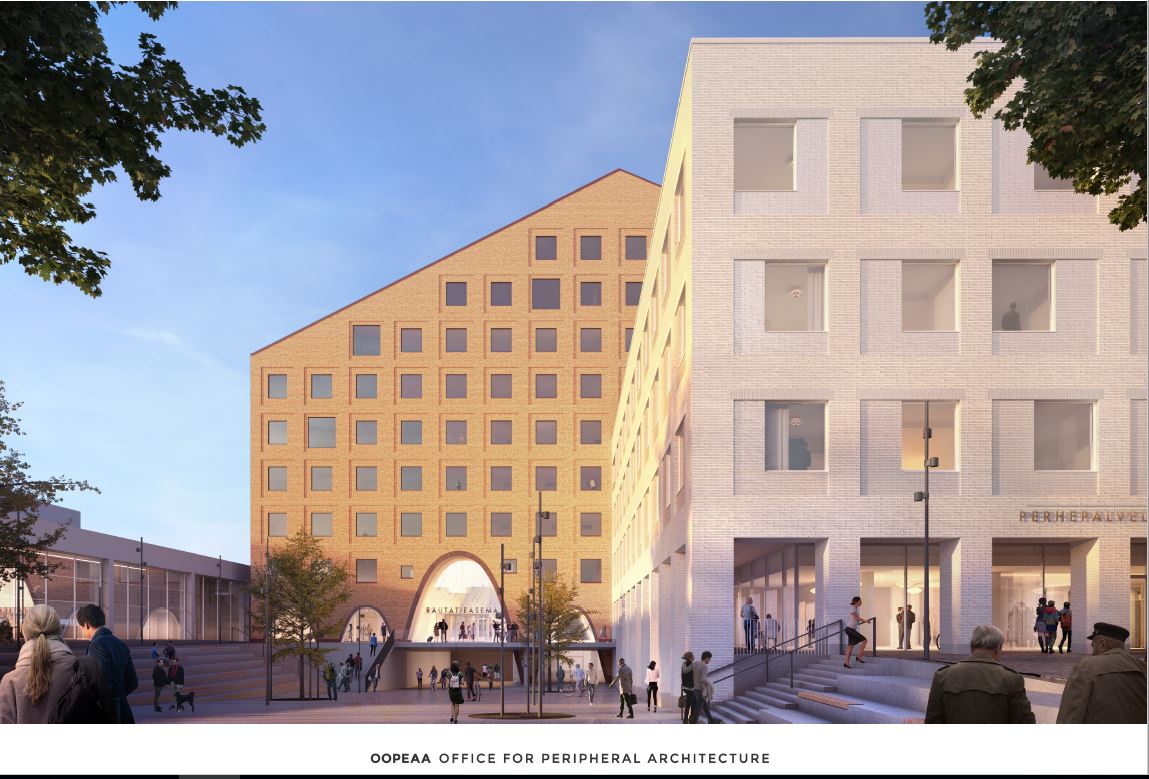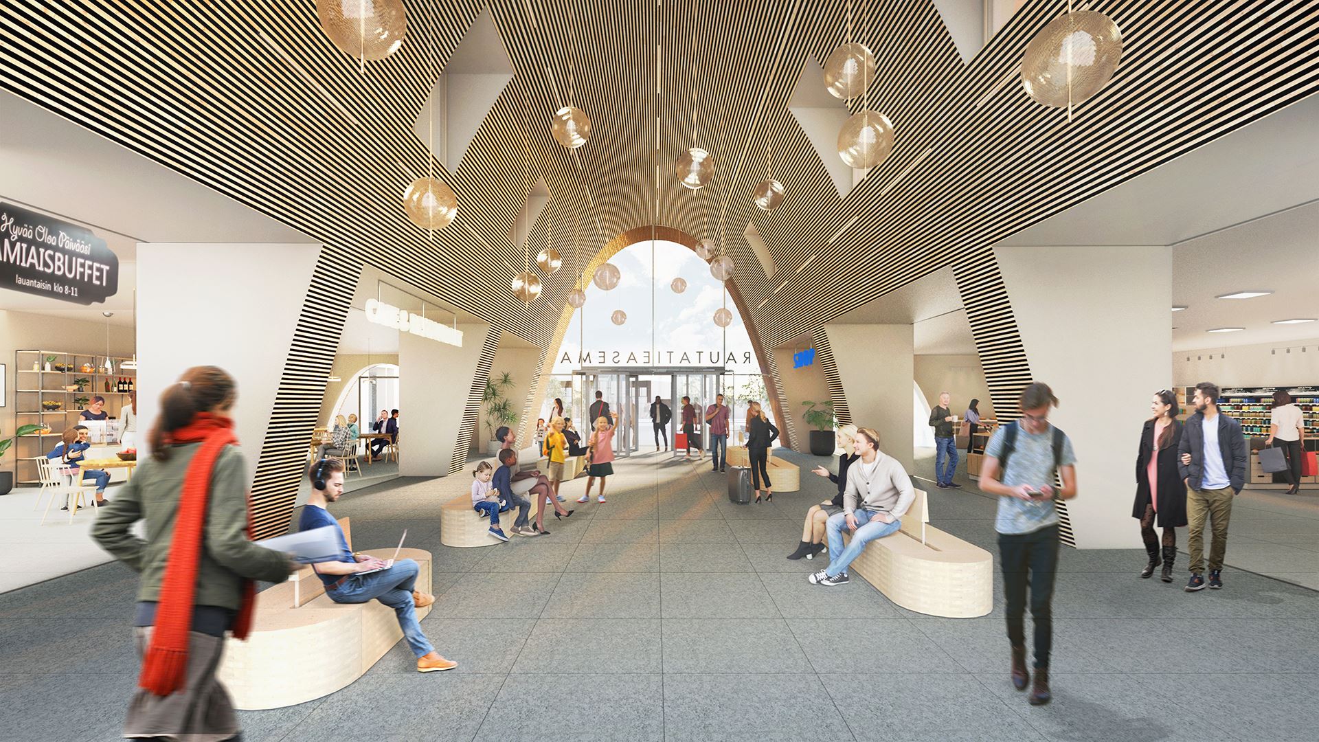 Uudelle rautatieasemalle kuljetaan punaisen rakennuksen kaarevista oviaukoista. Asema-aukion oikeassa reunassa sijaitsevassa valkoisessa rakennuksessa on perhekeskuksen sisäänkäynti.