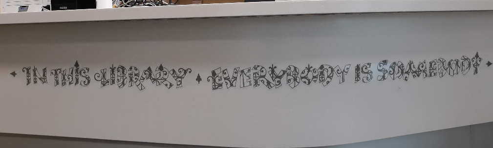 Kirjaston tiskin tekstin on tehnyt kalligrafi MarikaKK