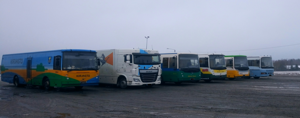 Kaiken kaikkiaan koulutuspäivästä jäi hyvä maku. Koulutuspäivät ovat mukavia opetuksellisen annin lisäksi myös siitä syystä, että ne keräävät yhteen useita kirjastoautoja ja kirjastoautonkuljettajia. Rivi kirjastoautoja Jalastuulen parkkipaikalla keräsi katseita, ja muutama ohikulkija otti valokuvankin.