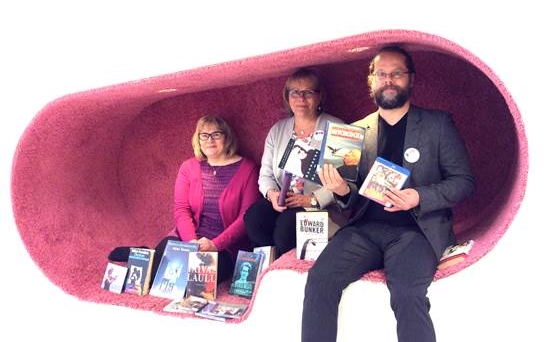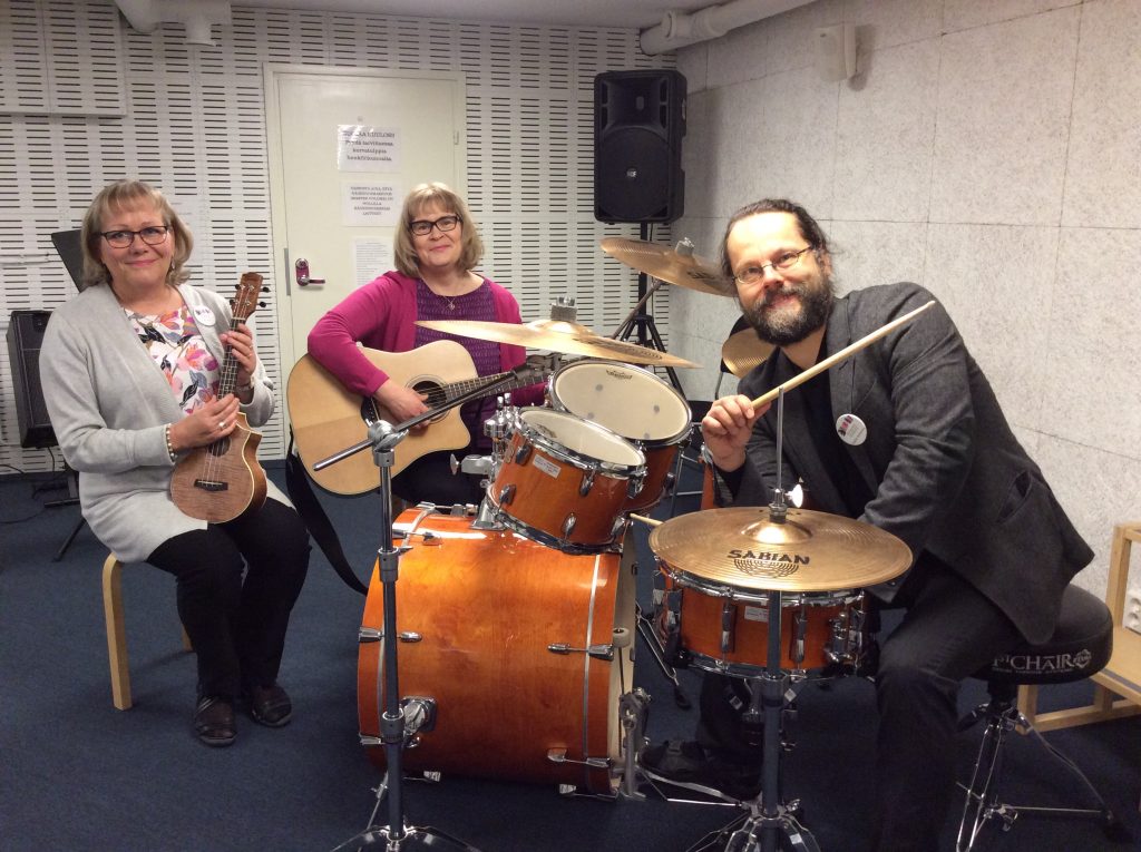 Musiikkipalvelujen Päivi, Pirjo ja Jarkko testailevat Pommarin soittimia ja akustiikkaa. Moni porukka ja yksittäinen soittaja ovat jo löytäneet tiensä Aallon kirjaston alakerran soittohuoneeseen, jota voi varata ilmaiseksi käyttöönsä.