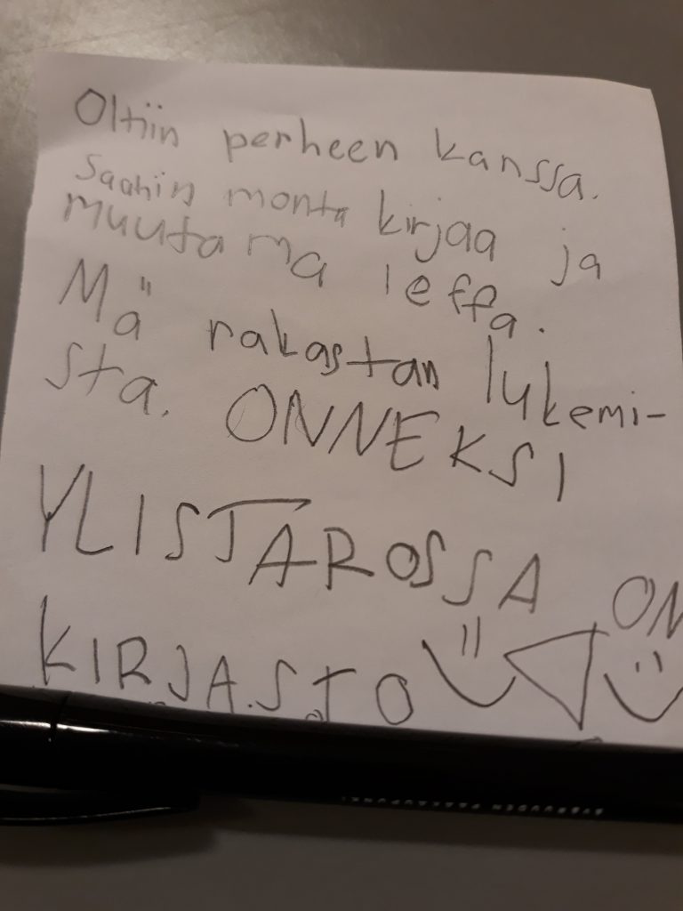 Sunnuntaina lapsiperheellä on vapaa-aikaa, on siis hyvä hetki käydä Ylistaron kirjastossa. Kirjastokortti näytetään ovella lukijalle, näppäillään pin-koodi, ja koko perhe pääsee ovesta sisään. Palautukset laitetaan palautushyllyyn ja sen jälkeen lähdetään rauhassa etsimään uutta lainattavaa. Isä lukee uusimmat lehdet, äiti etsii tietokoneelta opiskeluaineistoja ja lapset pelaavat lautapeliä. Kun kaikki ovat valmiita, lainataan lainausautomaatilla. Kirjasto on perheen lapsille muutenkin tuttu. Nuorempi lapsi käy perhepäivähoitajan kanssa satutuokioilla ja lainaamassa, vanhempi lapsi perjantaisin kirjastokerhossa.