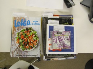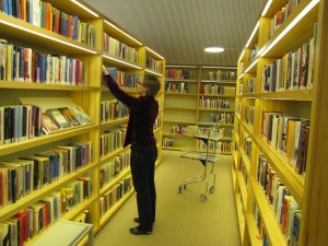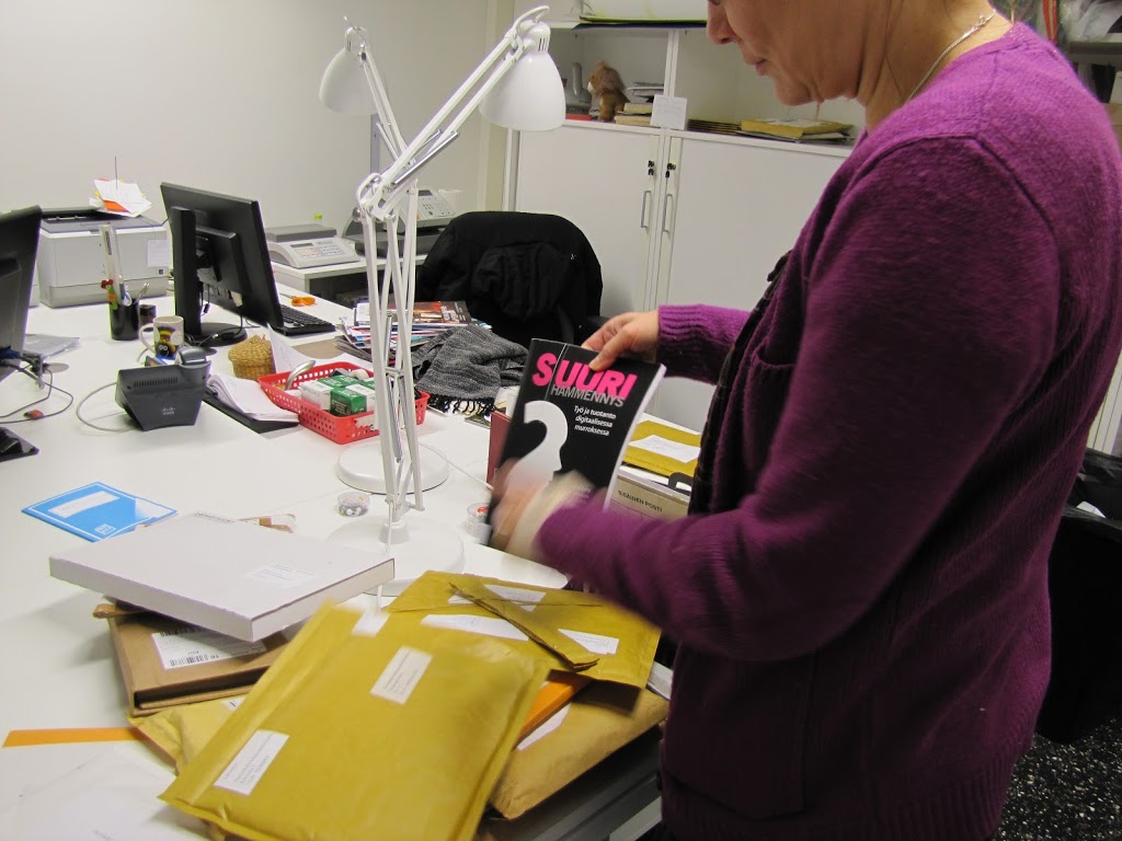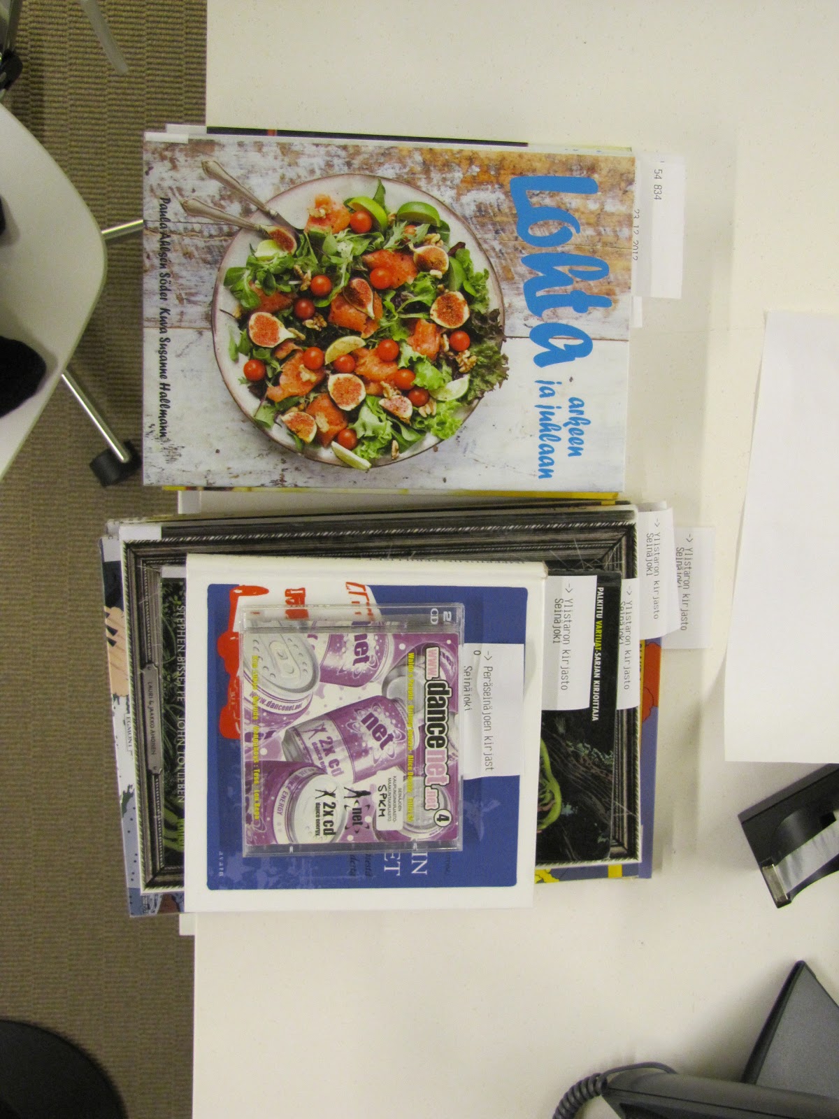 Päivän mittaan hyllystä haetaan uusia hyllyvarauksia, neuvonnassa vastataan etätietopalvelun kautta tulleeseen kysymykseen ja haetaan palautuksia logistiikkatilasta. Palautuneiden kirjojen hyllytystä jatketaan. Työhuoneissa tilataan uusia kirjoja ja muovitetaan sekä tarroitetaan jo saapuneita. Toisaalta taas kokoelmaa käydään läpi ja poistetaan vanhentuneita tai huonokuntoisia kirjoja.