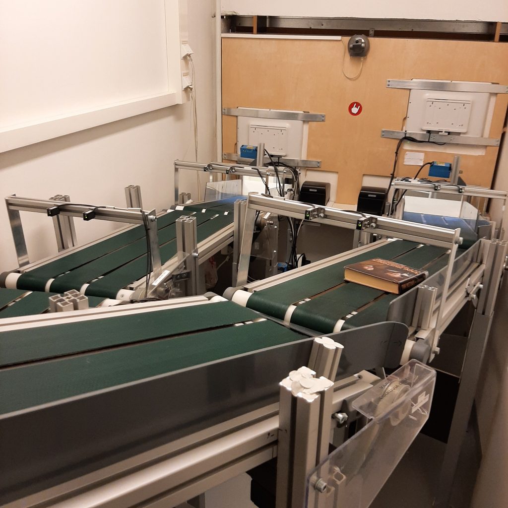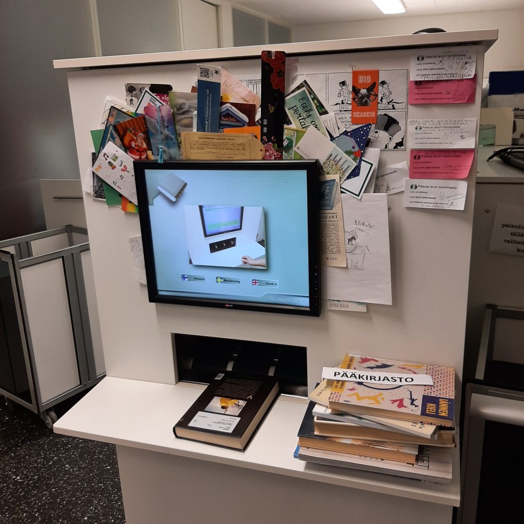Lajittelen sisuksiini palautetun aineiston 15:een eri laatikkoon. Saa siinä olla tarkkana, että kaikki palautukset osuvat oikeaan paikkaan; romaanit, tietokirjat, lasten osaston kirjat, nuorten kirjat, AV-materiaali, musiikki, Ykän ja Ilon kirjat, Aallon kirjaston aineisto, varattu materiaali, lähikirjastoihin matkaavat kirjat… Tämä lajittelu minulta kyllä sujuu, mutta henkilökunnan apua tarvitsen sitten laatikoitteni tyhjäämiseen, varausten käsittelemiseen sekä edelleen aineiston hyllyttämiseen.