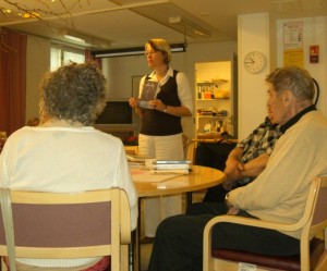 Esittely alkaa. Ryhmä kuuntelee tarkkaan ja nyökkäilee: Kirjastokortti on tuttu juttu useimmille ja kirjastoa on käytetty ainakin jossain elämänvaiheessa. Tällä kertaa ryhmässä on mukana myös innokas kirjallisuudenharrastaja ja kotikirjastopalvelun asiakas.