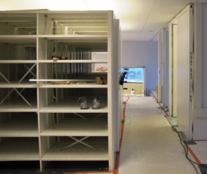 Varastohyllyt ovat jo paikoillaan sekä ensimmäisessä kerroksessa kirjastoauton varastossa (kuvassa) ja lehtivarastossa että alakerran kirjavarastossa.