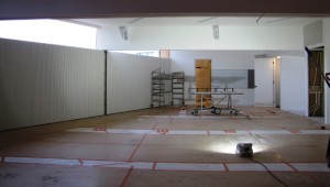 Joka puolella lattiat on huolellisesti suojattu. Tässä kuvassa näkyy osa Jaaksi-salista, jossa aikanaan saadaan nauttia kirjallisuudesta ja musiikista, ehkäpä myös tanssista ja teatterista sekä oppia uutta erilaisilla luennoilla ja seminaareissa.
