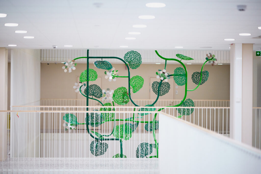 Pia Männikko’s sculpture Stolon in the lobby of the Aallokko Family Service Centre is inspired by sprawling plants that are among the most effective ones to spread in the nature. The artist got the idea for Stolon while weeding flower beds in her garden. The inspiration for the work is the ground ivy, which spreads enthusiastically. When one branch or growth direction breaks off, the plant tenaciously grows a new sprout to replace the old one. Stolon refers to the many aspects and stages of human life: learning new things, seeking and finding direction, continuums of life, and striving forward.