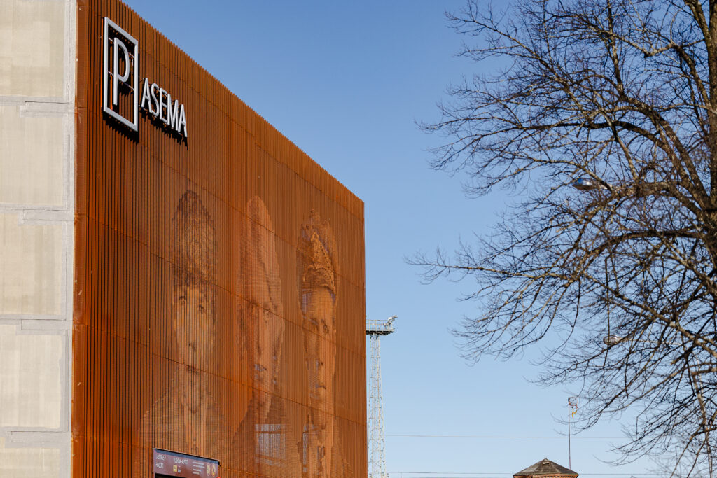 Juhana Moisander’s artwork Platform 0 is located on two external walls of the Seipark parking garage. The artwork has been created by perforating a photograph-based image in weathering steel elements (COR-TEN) on the facade of the building. The technique creates a raster image in which the size and number of holes draw out the image, creating variations of light and shadow. The work also includes a clock on the wall facing the platform.