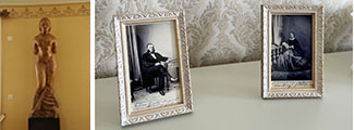 Mathildan salongista löytyvät kehystettyinä kartanon viimeisen patruunan ja patrunessan kuvat. Mathilda Wasastjerna (f. Donner), visiittikorttivalokuva sekä Gustaf August Wasastjerna, visiittikorttivalokuva. Visiittikortti (carte-de-visite) eli käyntikorttikuva oli yleisin valokuvan käyttöformaatti Suomessa ja ne yleistyivät 1860-luvulta alkaen. Pienen kokonsa puolesta visiittikortteja saattoi kantaa mukana esimerkiksi lompakossa ja jättää sen ”käyntikorttina” vierailuilla. Kuvat liimattiin kovalle korttipahvipohjalle ja niitä jaettiin lähipiirille, mielitietyille ja tallennettiin albumeihin.