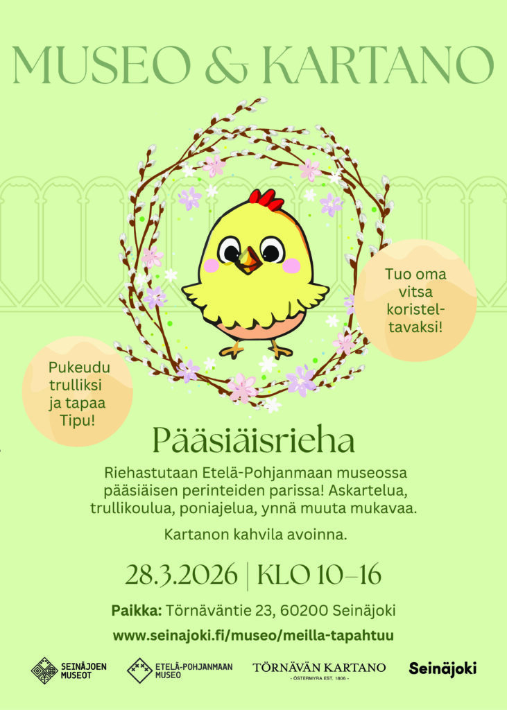 Riehastutaan Etelä-Pohjanmaan museossa perinteiden parissa! Askartelua, trullikoulua, poniajelua, ynnä muuta mukavaa. Kartanon kahvila avoinna. Tapahtuman Facebook -sivut löydät täältä.