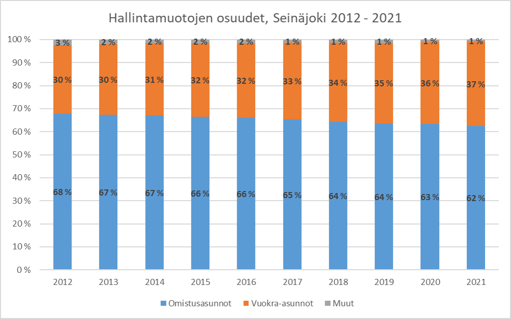 Selvästi suurin osa Seinäjoen kotitalouksista asuu omistusasunnossa, mutta vuokra-asumisen osuus on kasvanut vuosi vuodelta. Väkiluvun kasvu on heijastunut asuntokuntien (vakituisesti samassa asuinhuoneistossa asuvat henkilöt) määrään. Seinäjoella on 33 323 asuntokuntaa (v. 2023).