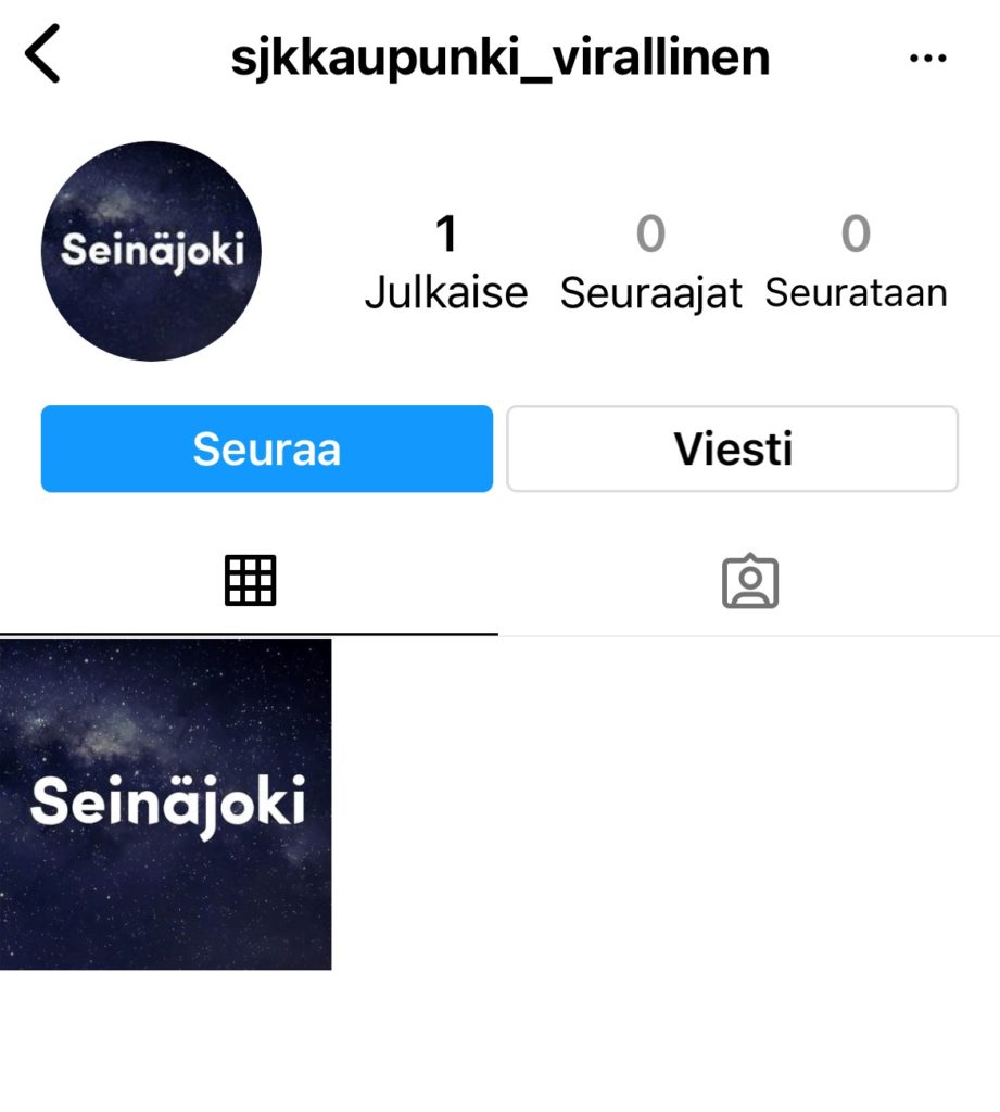 Instagramiin on perustettu myös sjkkaupunki_virallinen-niminen tili, joka ei ole Seinjäoen kaupungin hallinnoima. Tiliä ei kannata ryhtyä seuraamaan, ja voit tehdä käyttäjätilistä ilminannon (sisältöä, joka ei kuulu Instagramiin).