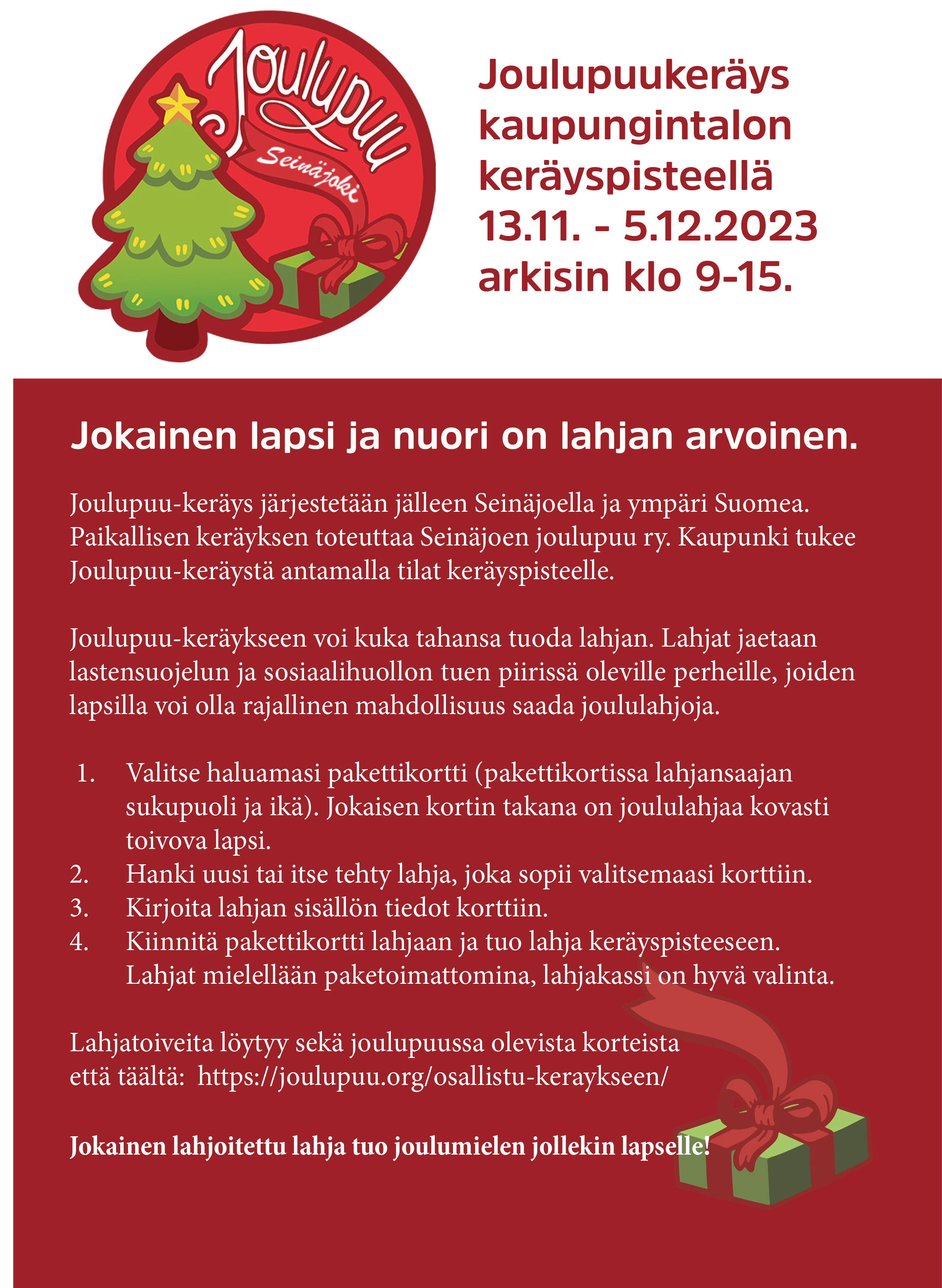 Joulupuu-keräys järjestetään jälleen Seinäjoella ja ympäri Suomea. Paikallisen keräyksen toteuttaa Seinäjoen joulupuu ry. Kaupunki tukee Joulupuu-keräystä antamalla tilat keräyspisteelle. Seinäjoen kaupungintalolla keräysaika on kolme viikkoa 13.11.-5.12. 2023. Keräyspiste on avoinna arkipäiväisin klo 9-15 kaupungintalon aukioloaikoina.