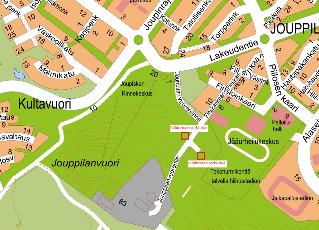 - Parkkialueet sijaitsevat pulkkamäen vieressä ja tien toisella puolella mäkihyppypaikan läheisyydessä (oranssit alueet)