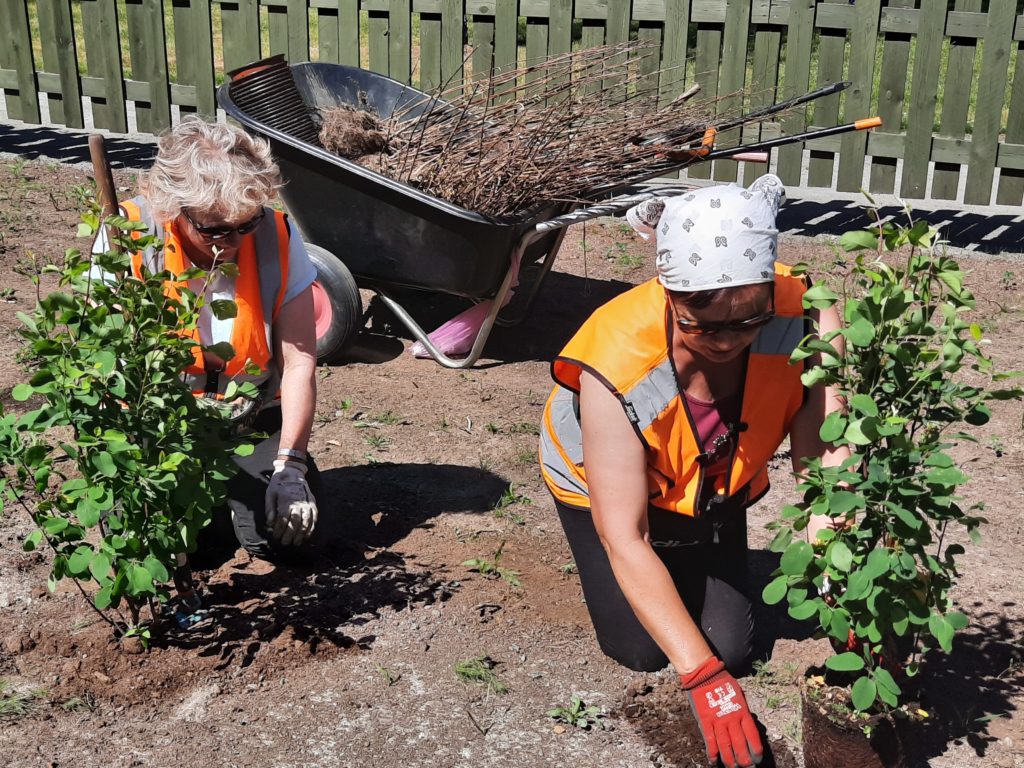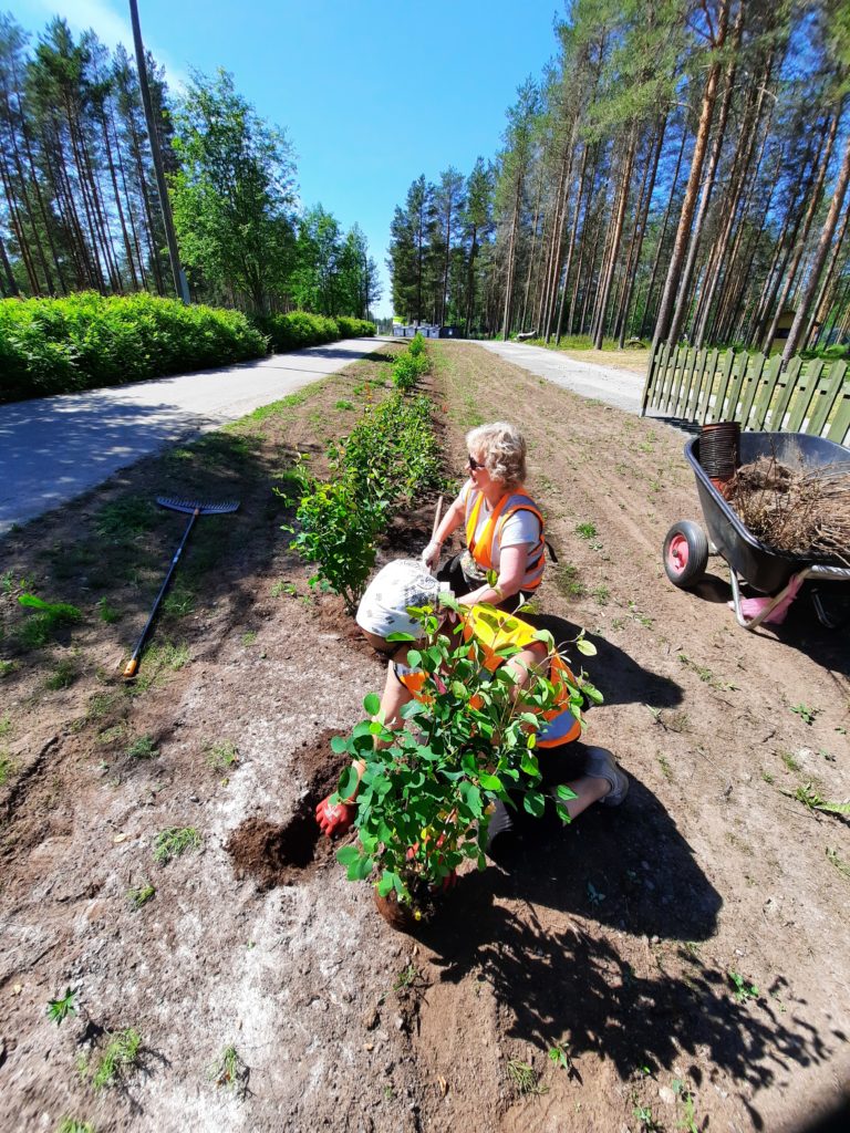 Myös työn jälki puhuu samaa kieltä; luotisuora rivi istutuksia janoaa vain vettä, muuten kasvuolosuhteet ovat ideaalit, kiitos Uusi-Pohjolan ja Köykän. Naiset kertovat, kuinka nyt istutusten alla oleva maa kasvoi vuosi sitten vielä aivan toisenlaista kasvustoa.