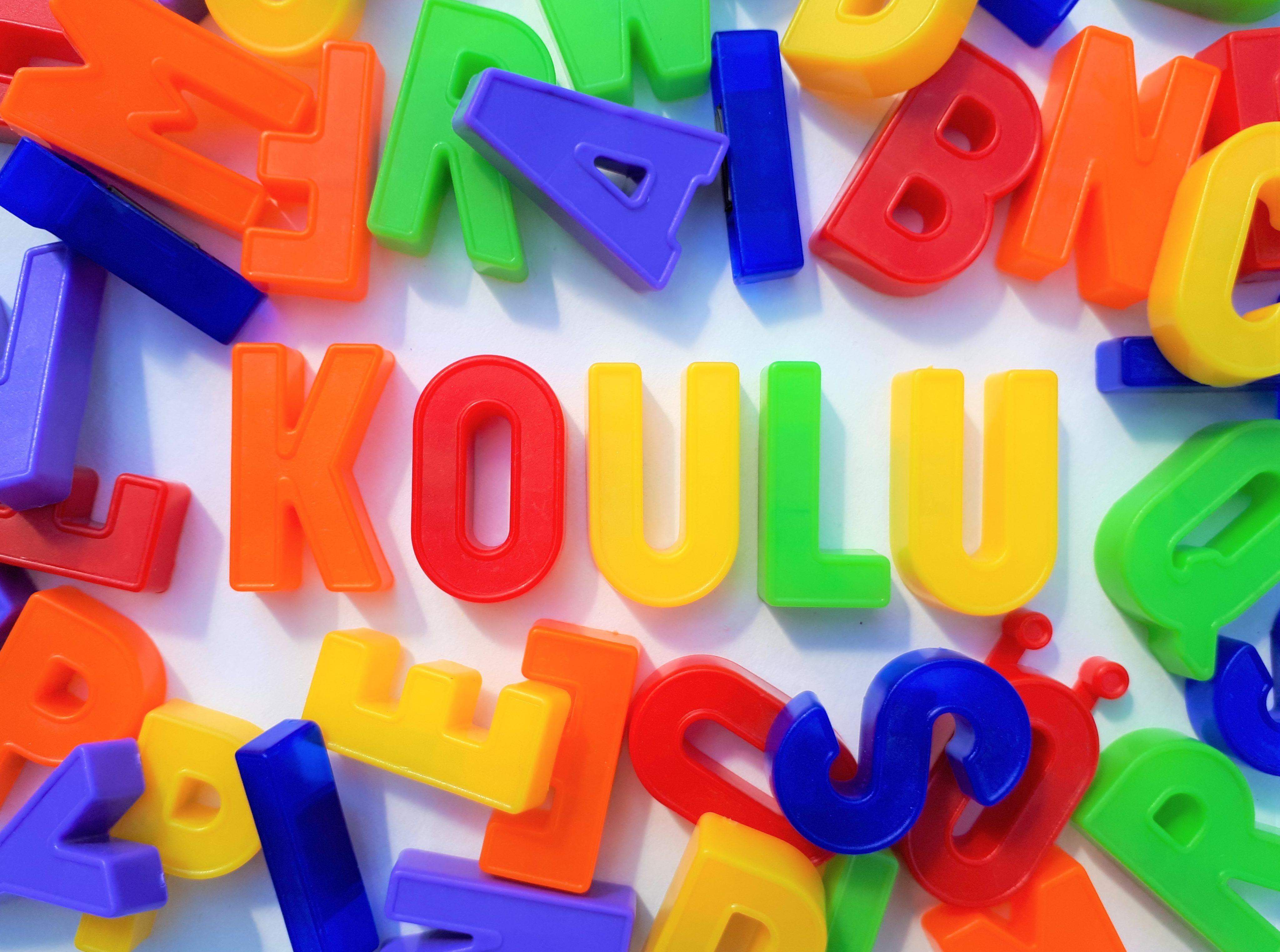 Värikkäitä kirjaimia, joista muodostuu sana koulu.