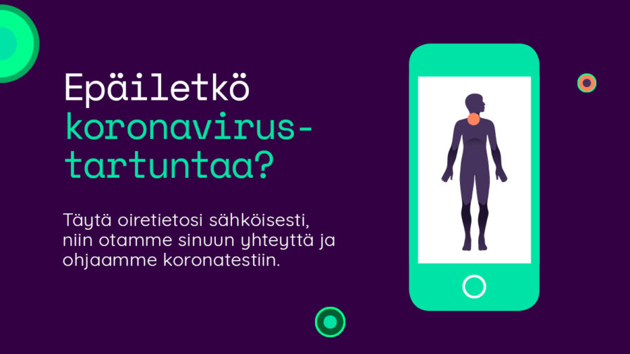 Jos epäilet saaneesi koronaviruksen tai sinulla on koronaan viittaavia oireita, täytä oiretietosi sähköisesti. Otamme sinuun yhteyttä tekstiviestillä tai soittamalla, ja ohjaamme sinut koronatestiin tai vastaanotolle.