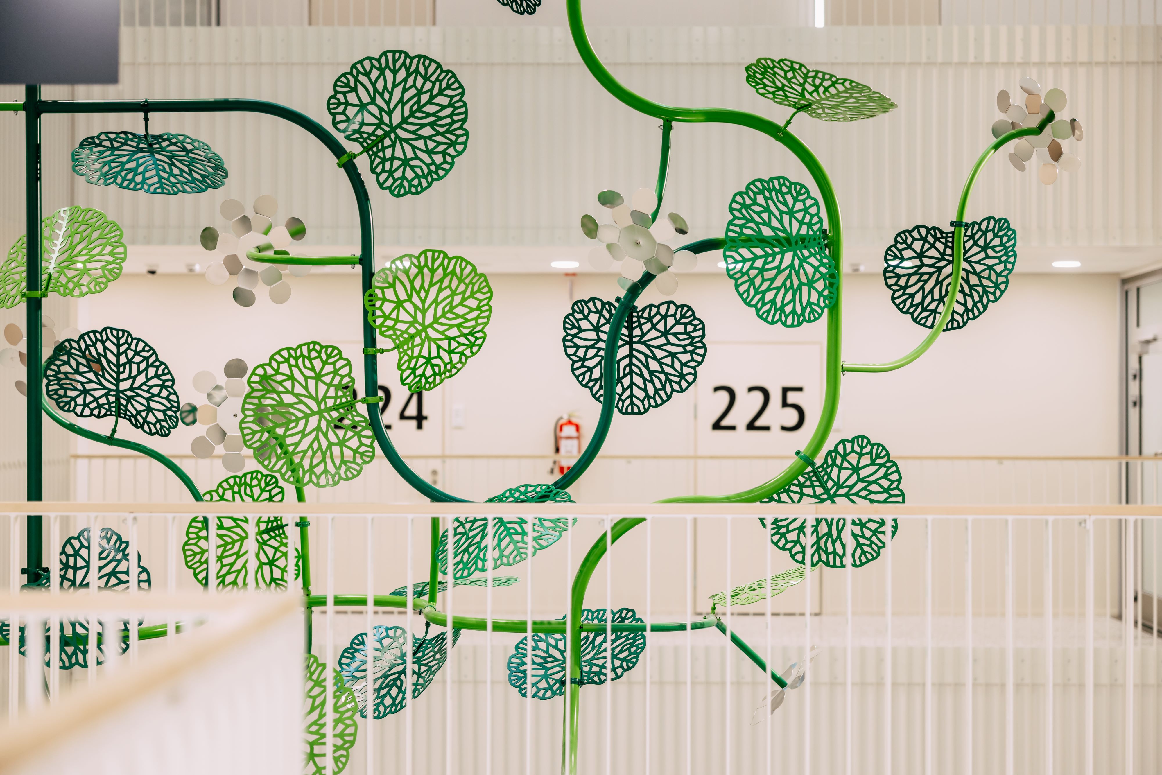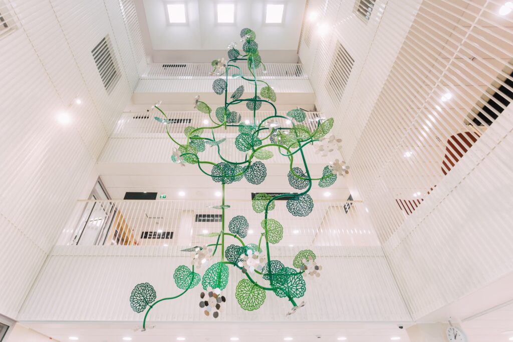 Taideteoksen suunnittelussa on otettu huomioon perhepalvelukeskuksen lapsiasiakkaat: teoksen kirkkaat värit ja pienistä osista koottu rakenne muistuttavat Lego-palikoita ja katosta kukkien kautta heijastuva valo heittää aulan seinille valoa ja varjoa.