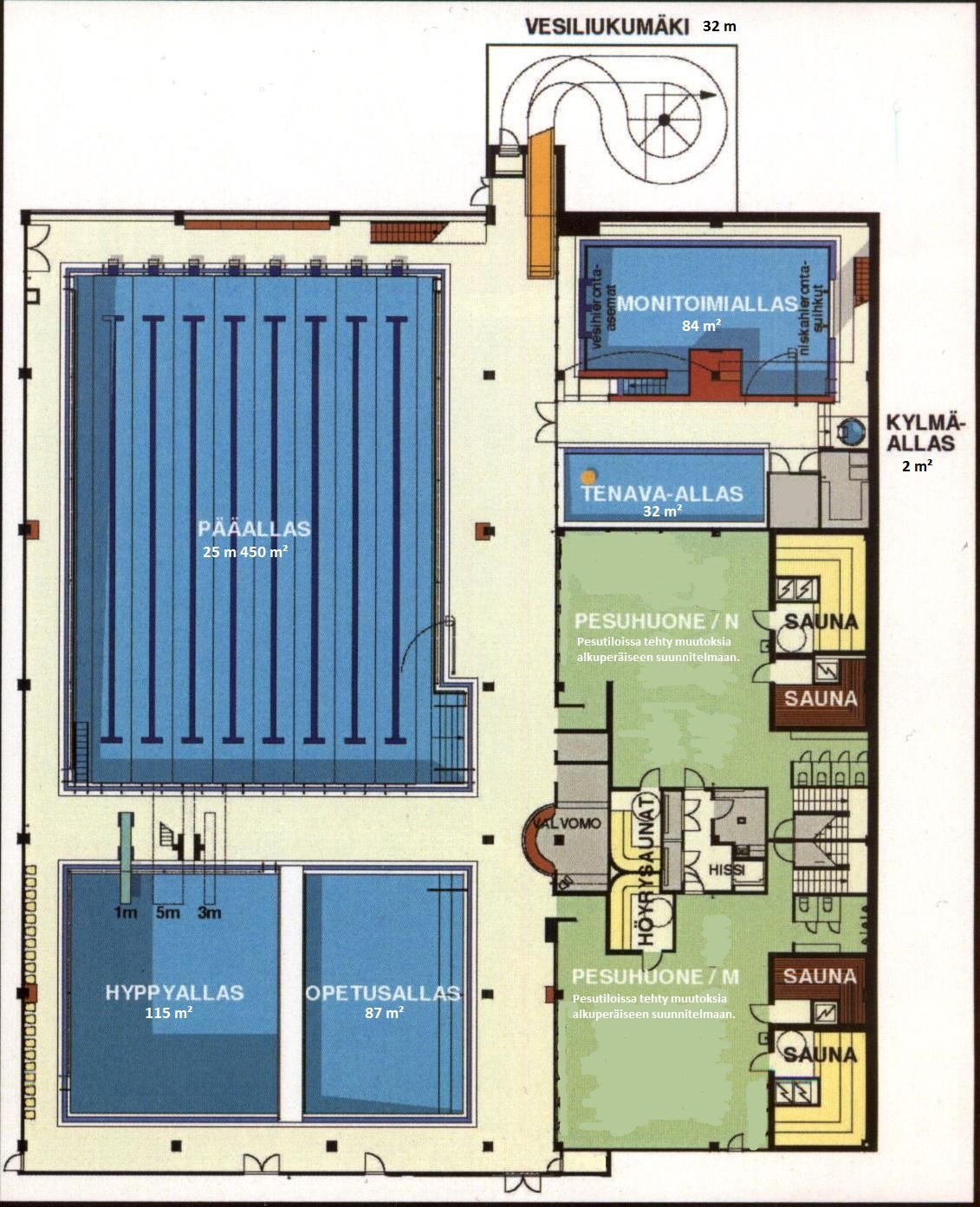 Ponnahduslaudat 1 m ja 3 m, hyppytorni 5 m, allas on jaettavissa 5. rataan.