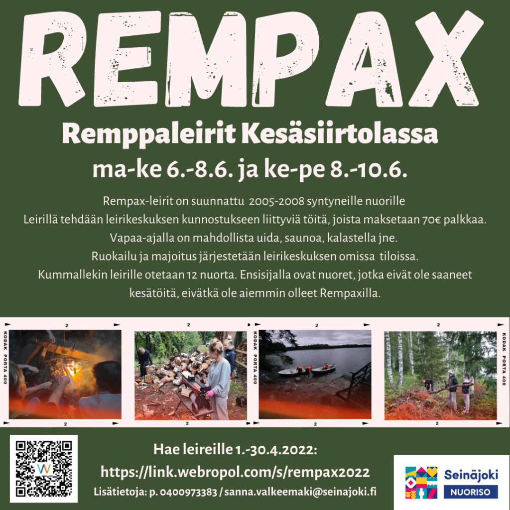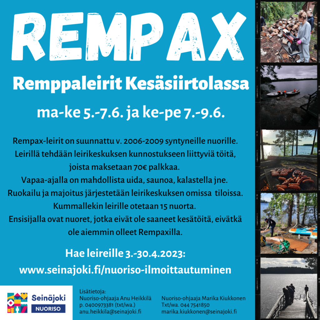 Seinäjoen nuorisopalvelut järjestää vuosittain kesäkuussa Rempax-leirin 14-17-vuotiaille nuorille kaupungin kesäsiirtolassa.