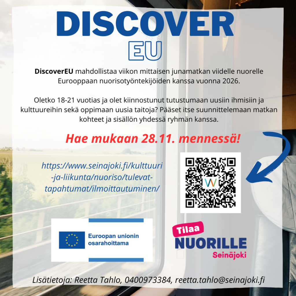 Mikä DiscoverEU hanke? Käy lukemassa 4.11. Nuorisokeskuksella pidetyn infotilaisuuden diat. DiscoverEU infotilaisuus (powerpoint)