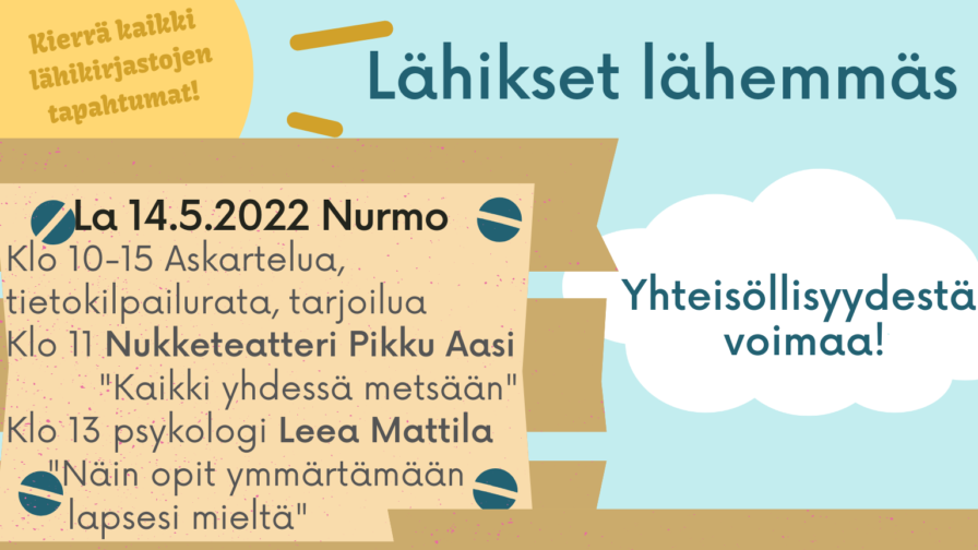 Seinäjoen lähikirjastoissa Nurmossa, Ylistarossa ja Peräseinäjoella järjestetään toukokuussa monipuolinen tapahtumakiertue. Tapahtumat toteutetaan eri päivinä ja niiden sisällöt ovat erilaiset, joten on mahdollista osallistua vaikka kaikkiin tapahtumiin. Tapahtumat on suunnattu koko perheelle ja ne ovat maksuttomia.