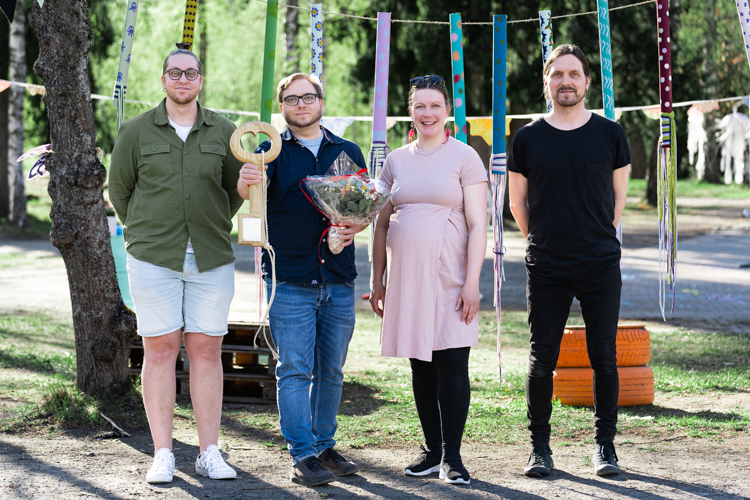 Kuvassa vasemmalta lukien: Lastenkulttuurituottaja Omar Zouiter, Lavain-palkittu Tuomo Kallio, lastenkulttuurikoordinaattori Tanja Huuskonen sekä taidekasvattaja Jarkko Salo.