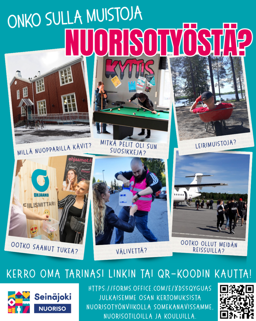 Jaa ikimuistoinen kokemuksesi ja muistosi meidän kanssa! Voit kirjoittaa muistosi tänne. Jaamme muistoja Nuorisotyönviikolla (vk 41) ja mahdollisesti myös myöhemmin somekanavillamme sekä julistein nuorisotiloilla ja kouluilla.