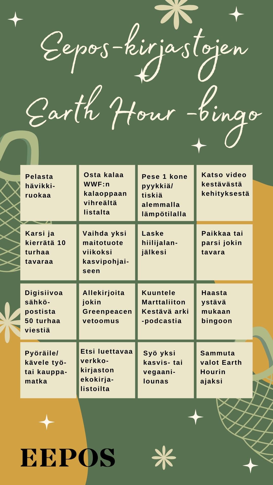 Seinäjoen kaupunginkirjasto osallistuu Earth Hour -tapahtumaan haastamalla sekä kirjastolaisia että asiakkaita pelaamaan ekotekobingoa. Bingo koostuu 16 arjen ekoteosta. Yhden ruudun voi kuitata esimerkiksi pelastamalla hävikkiruokaa, syömällä kasvis- tai vegaanilounaan tai katsomalla videon kestävästä kehityksestä.