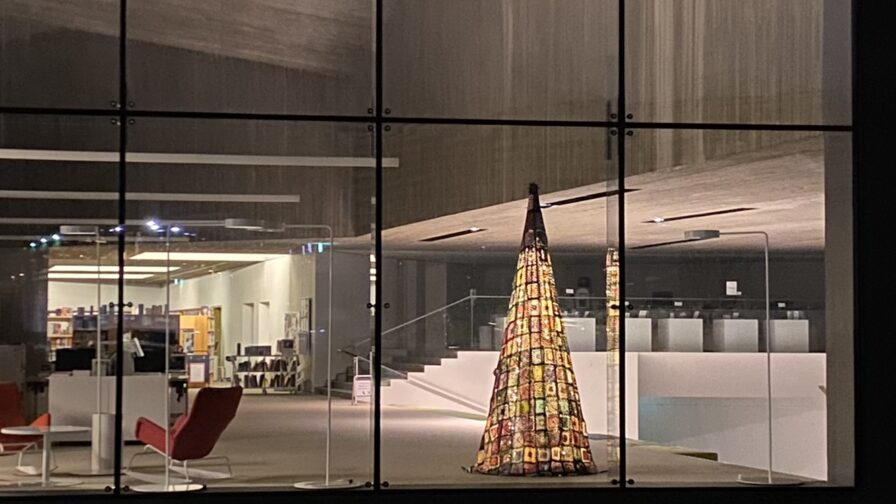 Kirjaston joulukuuseen sytytetään valot klo 18.45. Kuusi on koottu virkatuista isoäidinneliöistä yhdessä asiakkaiden kanssa vuonna 2022 osana Apila-kirjaston kymmenvuotisjuhlia.