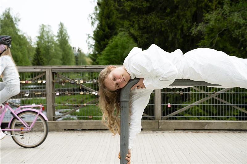 Kesäkuvataiteilijan voi bongata tutkimasta arjen ympäristöjä kehollisesti. Leikin paikkana voi yhtä hyvin olla rautatieaseman portaikko, kirjaston pyörätelineet, kuin satunnainen valopylväskin.