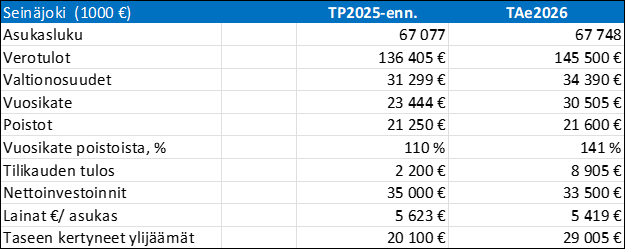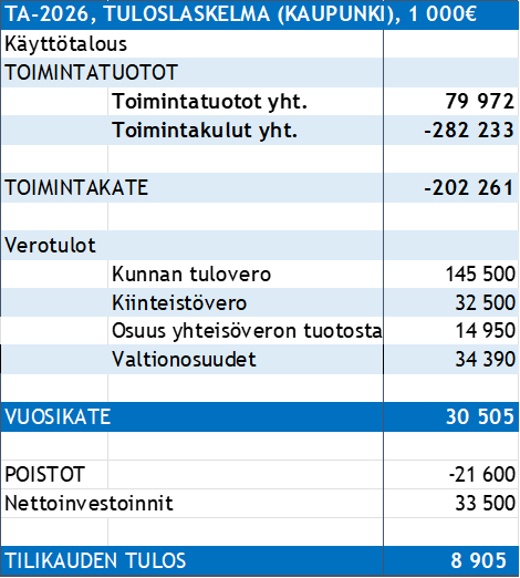 Kaupungin tilikauden tulos on ylijäämäinen 8,9 miljoonaa euroa ja vuosikate nousee 30,5 miljoonaan euroon. Nettoinvestoinnit ovat 33,5 miljoonaa euroa. Veroperusteisiin ei tehdä muutoksia, ja lainamäärän ennakoidaan laskevan 204 euroa/asukas vuoden 2025 tilinpäätösennusteeseen verrattuna.