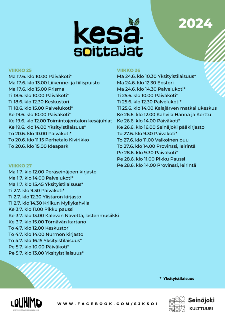 Seinäjoen kaupungin kesäsoittajien odotettu kiertue lähestyy. Viidestä nuoresta muusikosta koostuva bändi aloittaa harjoittelujaksonsa kesäkuussa ja valmistautuvat ilahduttamaan kuulijoita ympäri Seinäjokea. Kiertue alkaa 17. kesäkuuta ja kestää 5. heinäkuuta asti tarjoten maksuttomia musiikkiesityksiä kaikenikäisille useissa eri julkisissa kohteissa.