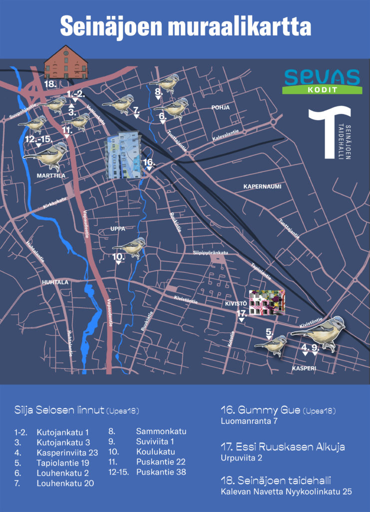 Lisääntyvä valo houkuttelee ulos kokemaan julkista taidetta. Suunnista muraalikartan avulla Silja Selosen kevättä enteilevien pikkulintujen luo Seinäjoen keskustaan, Kasperiin, Marttilaan ja Pohjaan! Kasperista löydät siivekkäiden lisäksi Essi Ruuskasen uunituoreen muraalin Alkuja, joka kommentoi luonnon ihmeellistä kiertokulkua.