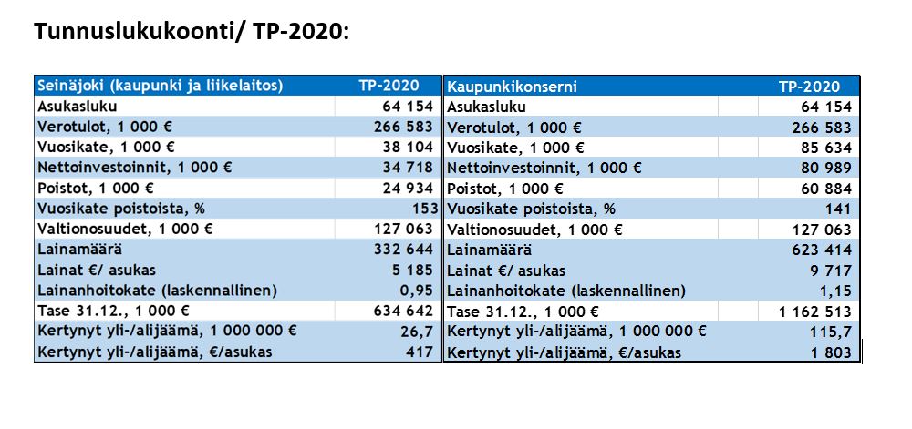 Emokaupungin vuosikate on kahden negatiivisen tulosvuoden (2018–2019) jälkeen vahvistunut toistasataa prosenttia ja on 38,1 miljoonaa euroa. Vuosikate kattoi vuonna 2020 kokonaan poistot ja nettoinvestoinnit. Myös konsernin vuosikate vahvistui ja on nyt 85,6 miljoonaa euroa.