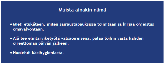 Jos perheenjäsenissä tai muussa lähipiirissä on vatsaoireita, noudata elintarviketyössä erityistä varovaisuutta ja huolehdi tehostetusti käsihygieniasta.