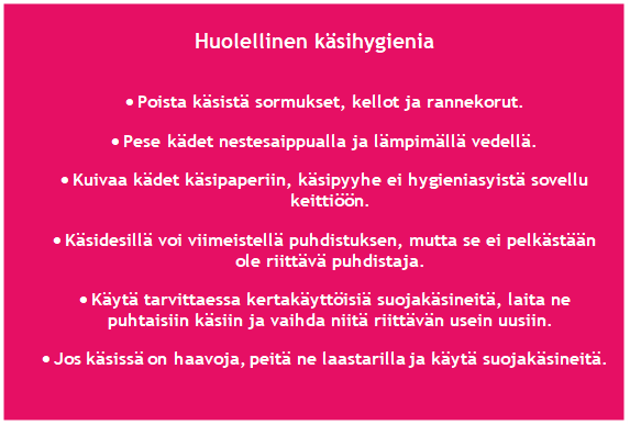 Huolellista käsihygieniaa tulee noudattaa aina! Esimerkiksi norovirusta voi erittyä ulosteisiin jo ennen oireiden ilmaantumista, eli myös oireeton saattaa olla tartuttava.