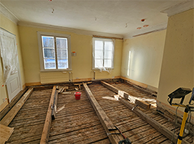 Tästä huoneesta tulee pikkusalonki, jota voi varata käyttöönsä erillistä maksua vastaan kahvilan aukioloaikoina. Alkuperäinen lankkulattia on kaivettu esiin muovimaton alta, se kunnostetaan ja lattia palautetaan alkuperäiseksi.