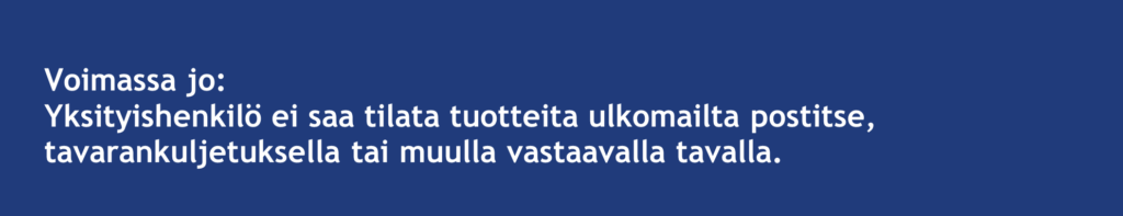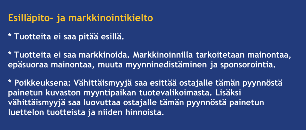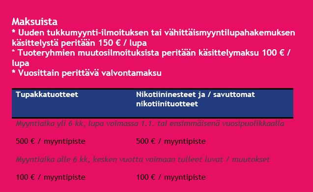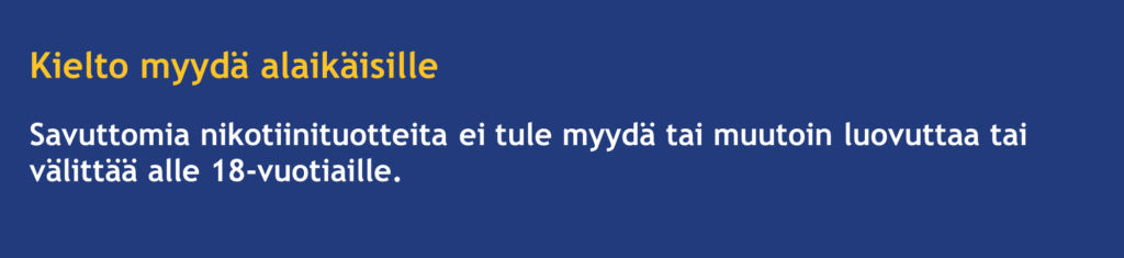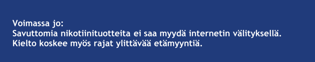 Savuttomien nikotiinituotteiden myynti on vaatinut voimassa olevan tupakkatuotteiden vähittäismyyntiluvan. Ilman vähittäismyyntilupaa, savuttomien nikotiinituotteiden myynti ei ole sallittua.