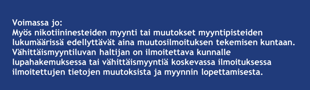 Voimassa olevan tupakkatuotteiden vähittäismyyntiluvan omaavilla toimijoilla, jotka eivät tehneet muutosilmoitusta ajoissa, ei ole enää 1.11.2025 alkaen lupaa myydä savuttomia nikotiinituotteita ennen kuin ovat tehneet muutosilmoituksen ja saaneet kunnalta ilmoituksen sen käsittelystä.