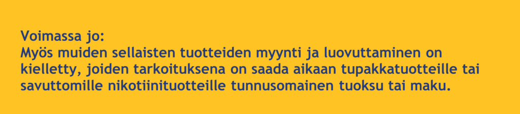 - Savuttomissa nikotiinituotteissa ei saa olla muuta tunnusomaista tuoksua tai makua kuin mentolin ja mintun maku. Myös näiden makujen yhdistelmät on kielletty.