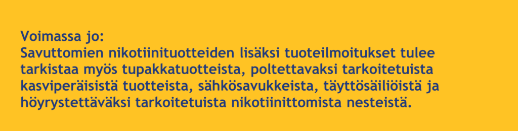 Jälleen uusi muutos tupakkalaista astui voimaan 1.8.2025. Laissa on huomioitu uusi tuoteryhmä, savuttomat nikotiinituotteet. Näistä puhuttaessa käytetään usein termiä nikotiinipussit.