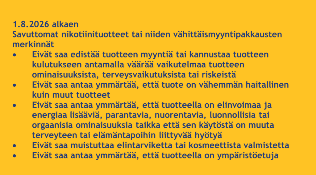 Myös savuton nikotiinituote itsessään ei saa muodoltaan, väriltään, pinnaltaan tai muulta ulkoasultaan erottua muista saman tuoteryhmän savuttomista nikotiinituotteista.